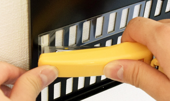 テレビ裏ブラケットの下部のひっかけ部分に、2本目のテレビハンガーを載せるようにして取り付けます。2本目のテレビハンガーのねじ止めは、側面の2か所、左右合わせて計4か所のみとなります。