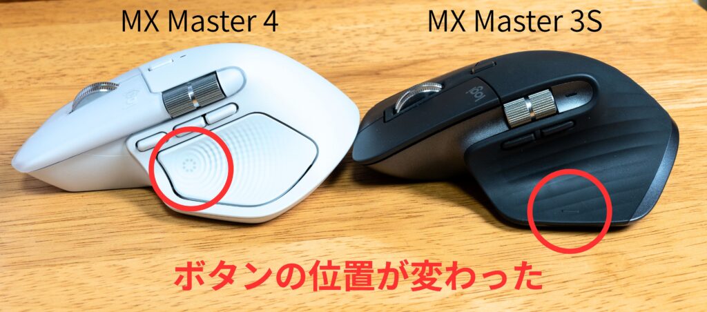 これは完全に個人の主観だけどボタン配置はよくなっていると思います。一番変わったところはActions Ringボタンの配置でMX Master 3Sと比べるとかなり押しやすい位置になっています。MX Master 3Sではまったくこのボタンを使っていませんでした。