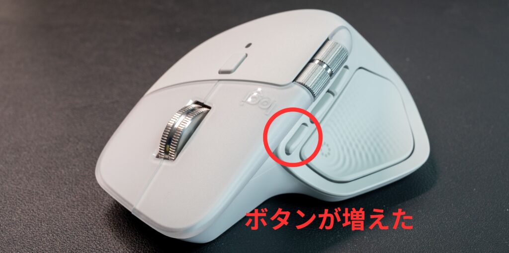 マウスを左側面から見てみると、ボタンが4つあってMX Master 3Sから1つ増えています。そして今回の目玉機能であるActions Ringボタンは位置が変わっていて押しやすい位置になっています。MX Master 3Sは親指を大きく動かさないといけなかったのでいい変更だと思います。
