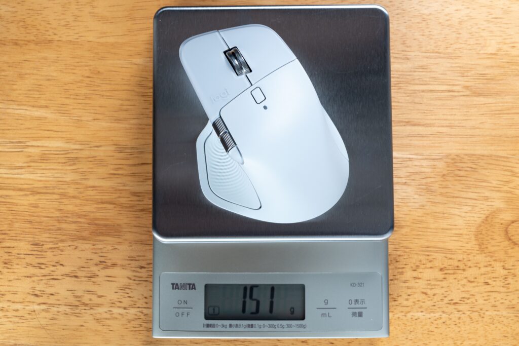 MX Master 4の重さは151gでした。MX Master 3Sから10g重くなっていますが実際の使用感には何も影響を感じないので気にしなくて問題ありません。