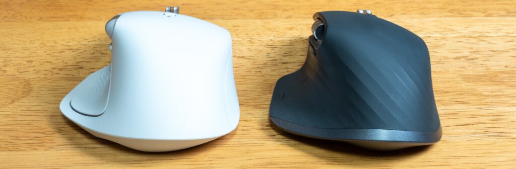 画像では分かりにくいですがMX Master 4とMX Master 3Sを後ろから見比べてみると、マウスを持ったときに親指の付け根にあたる部分がMX Master 4は少し膨らんでいます。この差が手が小さい人にとってどれくらいの影響が出るかは分かりませんが、少なからず「大きくて持ちにくい」となる方が出てくるかもしれません。