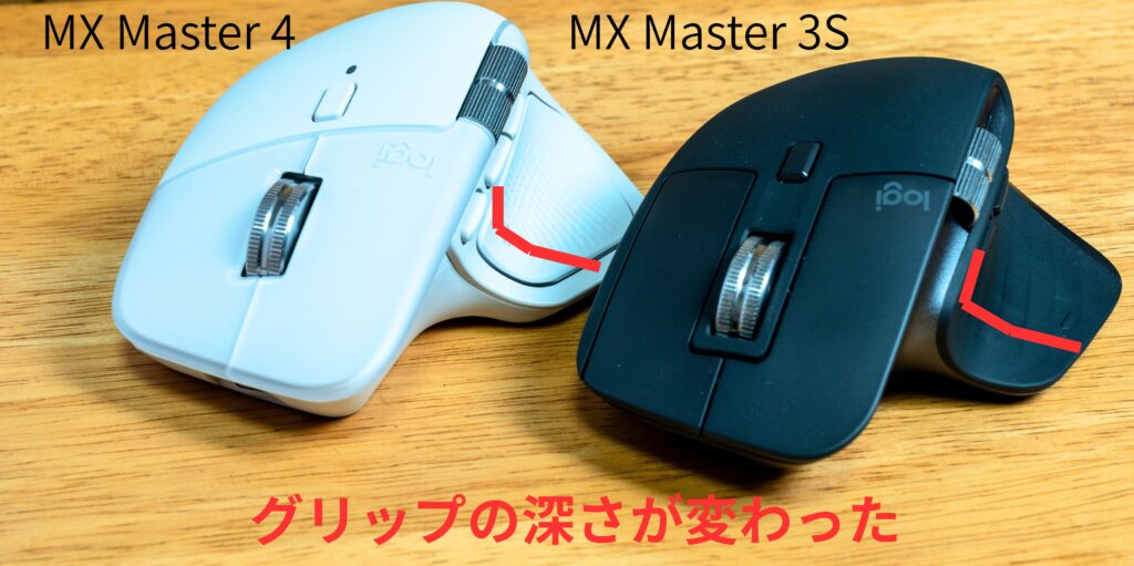 あと地味に嬉しいのが進む / 戻るボタンが押しやすくなったことです。MX Master 4の方がグリップの深さが浅くなっているようでこれによってボタンの押しやすさが増しているようです。ちなみにグリップが浅くなったからといって使用感に影響はまったくないので安心してください。