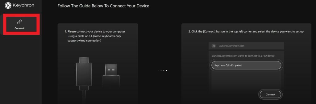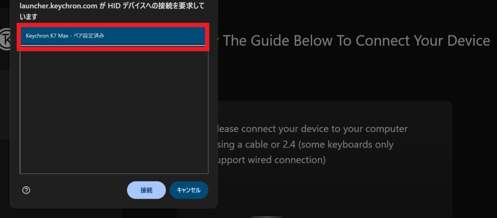 キーボードとPCを有線でつなぎます。後に開くKeychron Launcherでは、「2.4GHzの無線ドングルでも大丈夫」みたいなことが書いてありましたが、僕はドングルではランチャーと接続できませんでした。
