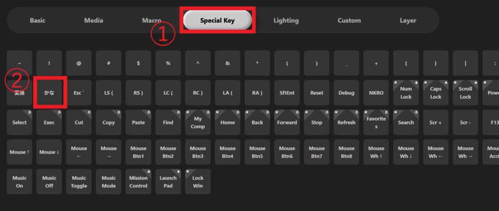 "Special Key"の項目にある「かな」や「変換」など、任意のキーをクリックする。