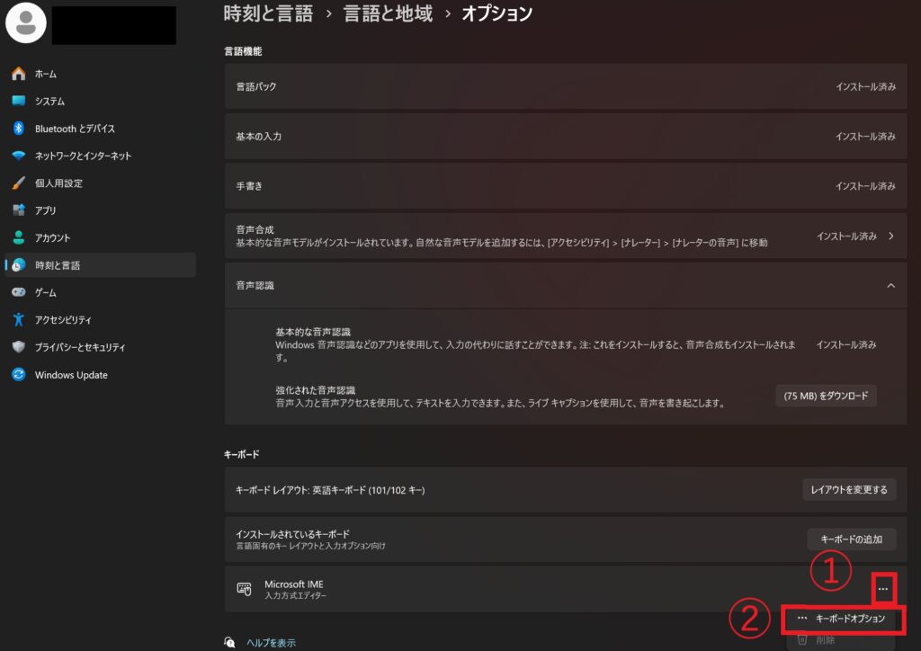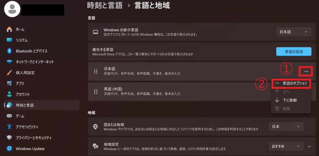 日本語の個所の「・・・」を押し、「言語のオプション」をクリックする。