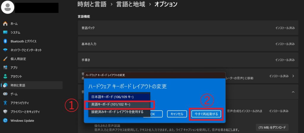 プルダウンメニューから「英語キーボード(100/102キー)」を選択して「今すぐ再起動する」を押す。